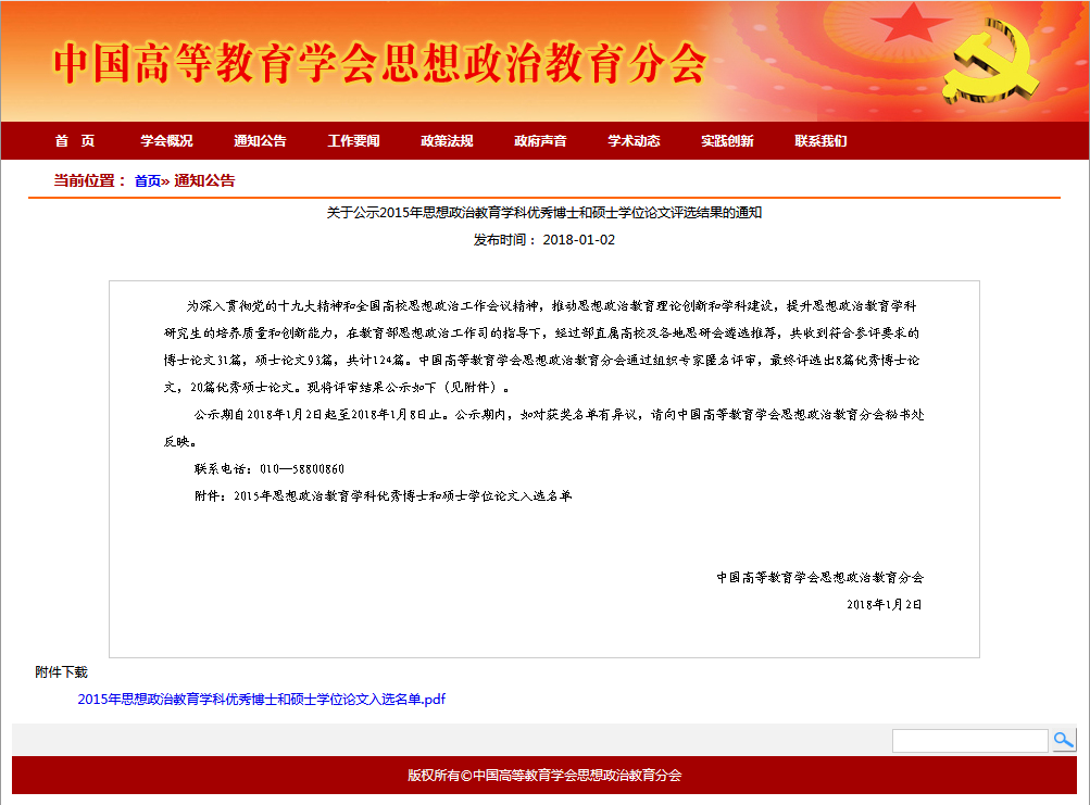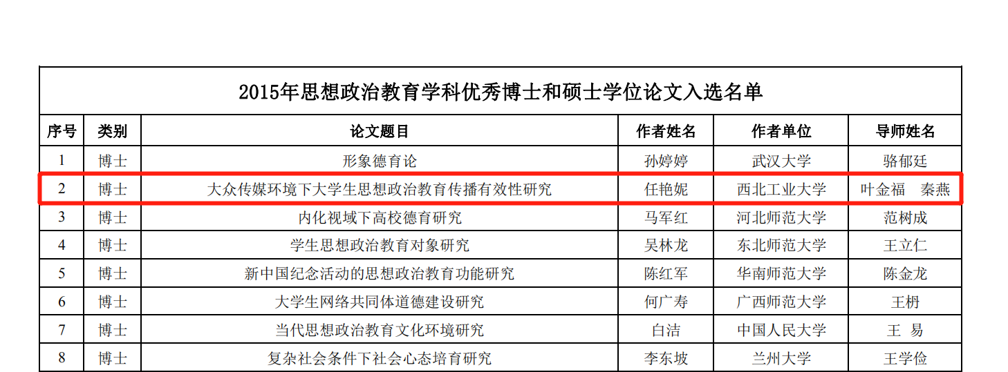 中国高等教育学会思想政治教育分会于2016年11月开展针对2015届全国思想政治教育学科优秀博士学位论文评选工作,评选结果于近期公布,Acfan