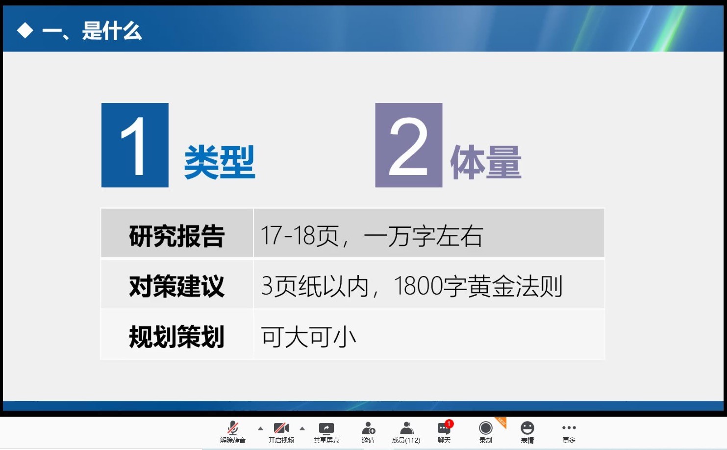 程圩研究员结合自身研究成果和实践经验主要从三个方面讲述了撰写决策咨询报告的意识和思维。首先,程圩研究员从决策咨询报告“是什么”“为什么”“为谁做”“我是谁”四个方面分别介绍了决策咨询报告的概念、撰写决策咨询报告的原因及目标定位,从而引入决策咨询报告和学术论文的区别;其次,强调了撰写决策咨询报告应该具备的四大意识,即时代意识、问题意识、目标意识、前瞻意识,以此启发我们撰写决策咨询报告应该具备项目思维、数字思维、政策思维、统筹思维,并要求我们在平时的研究中应该注重从产学研各方面整合各项资源,发挥企业、高校、专家、管理部门等各方面优势,突出集体智慧,并思考如何让报告更加接地气,真正将成果写在大地上;再次,程圩研究员总结了决策咨询报告的几点忌讳,并结合具体案例对文章谋篇布局提出了几点建议,增强决策咨询报告的实用价值和指导功能,更加体现治理能力和治理水平的现代化要求。