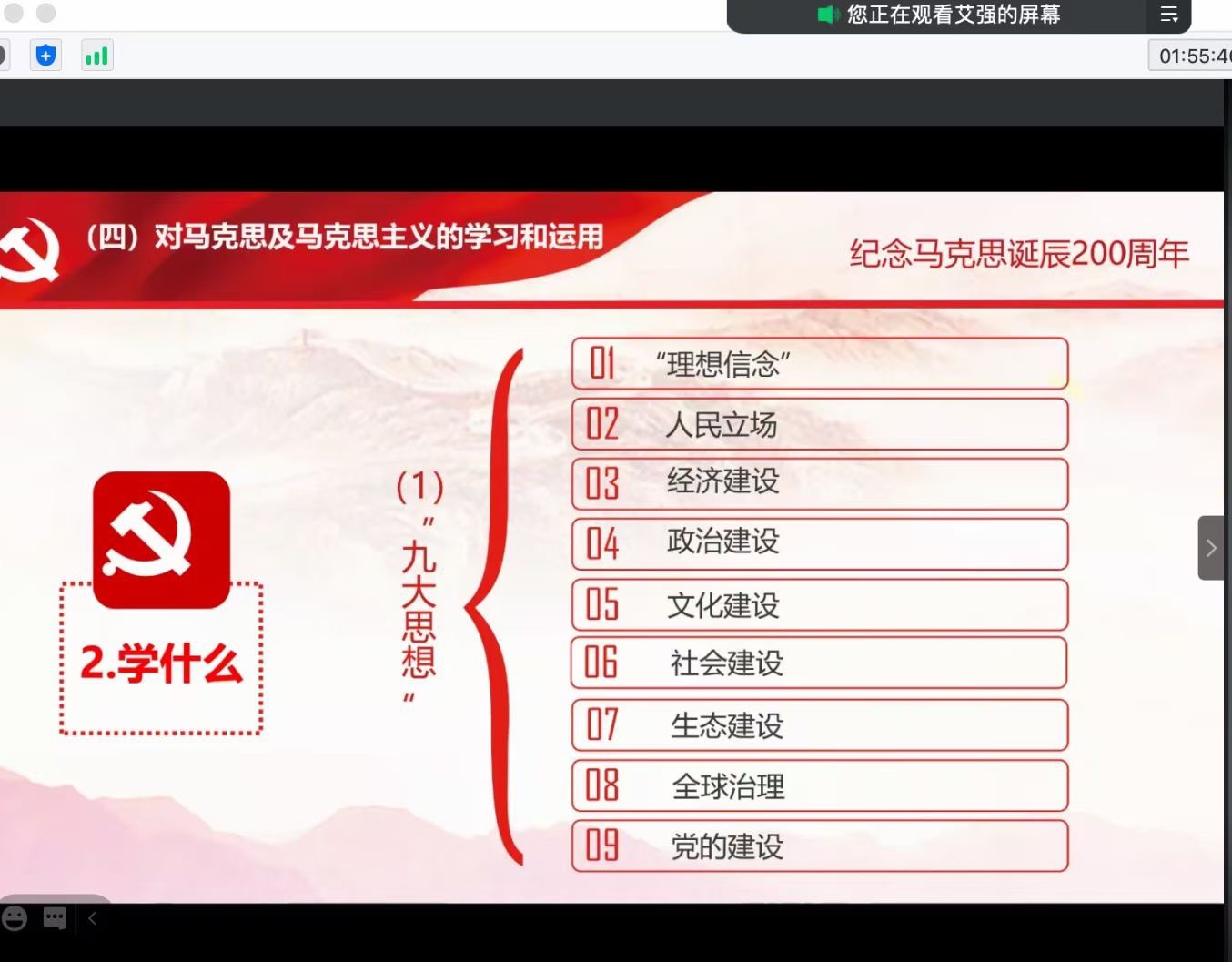 博士生艾强从马克思主义的形成、内容与特征,三个方面切入主题着重谈到讲话内容中所提到的“九大思想”等内容进行分析导读,还谈到了国内外对此次讲话的评价和对马克思以及思想方面的研究。