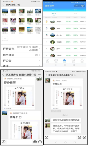 工会积极响应陕西省总工会等部门联合开展的“我要上全运,奋进小康路”健步走活动的号召,第一时间在全院范围内进行了广泛的宣传和动员,精心组织了一支15位成员的参赛队,并建立了健步走微信群,参赛队员们线上分享劳模故事和健身经验,线下开展形式多样的体育比赛和锻炼活动,在浓厚的健身氛围下,参赛队员们你争我赶、互相提醒、互相监督,形成了一股健身热潮。