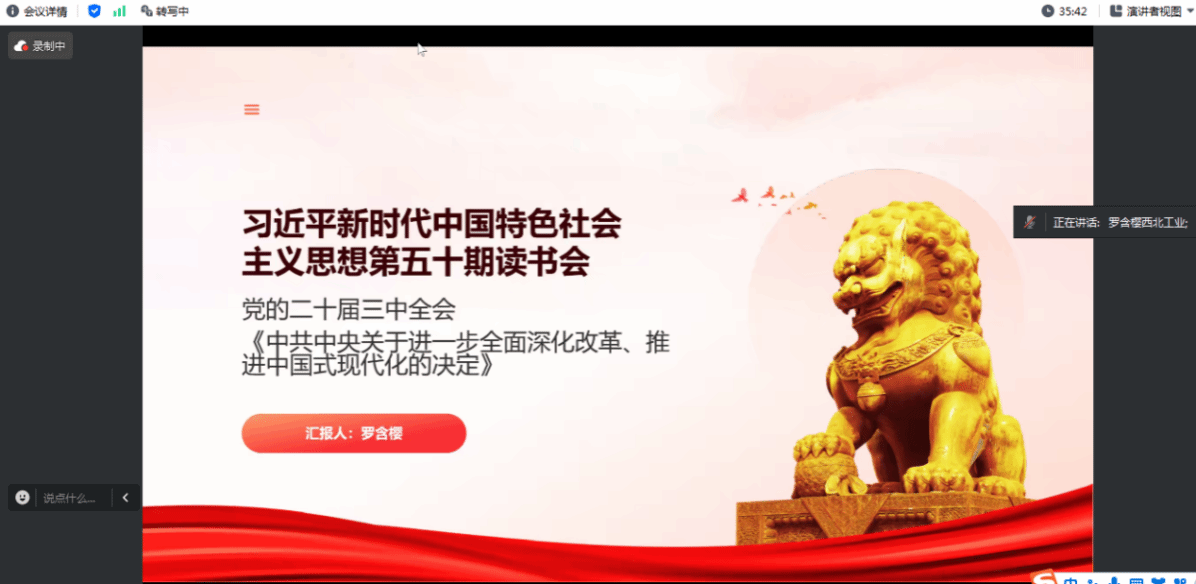 接着,博士生罗含樱同学对《决定》的形成过程及其基本内容进行了详尽阐述。她从历史意义、系统观念、学术研究三个维度,分享了对党的二十届三中全会精神的深入理解。罗含樱认为,党的二十届三中全会彰显了中国共产党在百年变局中的历史主动性,具有重要的历史意义。党的二十届三中全会不仅把握了世界历史的转向,还推动了世界经济复苏,并为世界发展提供了中国方案。