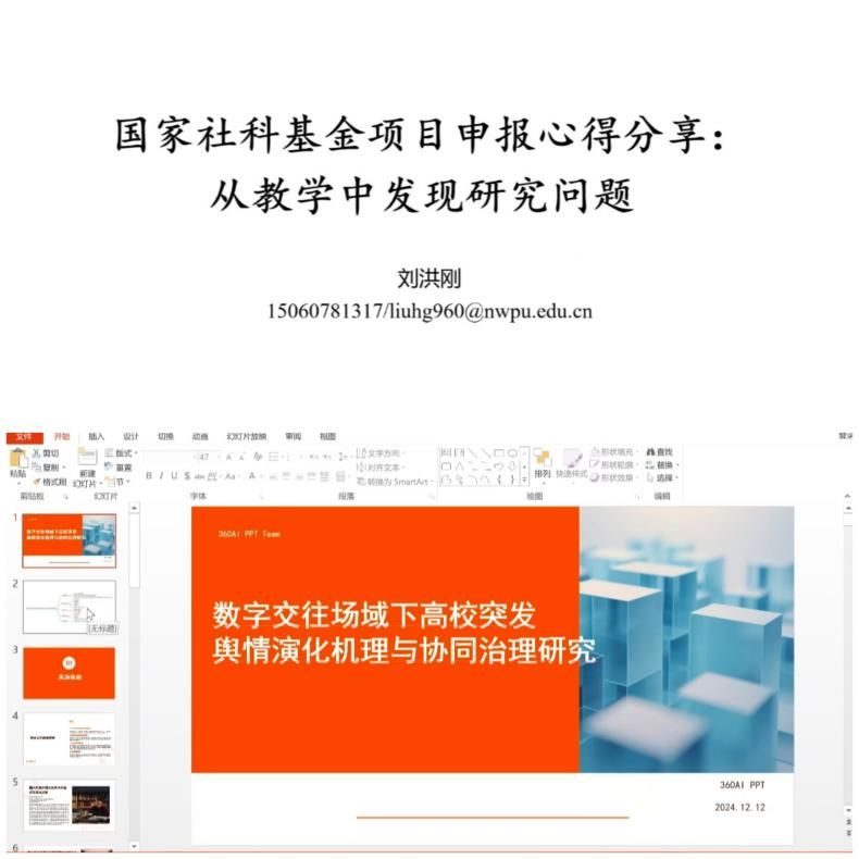 刘洪刚教授首先从教与研关系之思考及国家社科基金项目申报的几点体会出发,细致讲解了其本次国家社科基金申报选题由来、所遇困惑、解决思路及心得感悟。随后,刘洪刚教授和贺苗副教授结合其本次国家社科基金申报材料撰写为各位老师逐项细致剖析,并从自身实际出发,为与会师生深入分析了如何从教学过程中寻求科研选题的切入与创新,为大家提供了丰富的申报思路和技巧经验。
