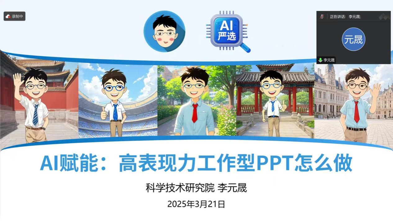 邀请校科学技术研究院科研质量保密与科研服务大厅办公室主任、助理研究员李元晟老师开展了题为“AI赋能:高表现力工作型PPT怎么做”的第31期以研促教seminar专题讲座。本次会议由Acfan