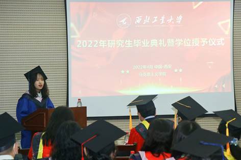 2019级马克思主义基本原理专业硕士研究生周家欣作为毕业生代表发言,对学院老师们的耐心指导表达感激,对学校学院提供的资源和环境表示感谢,在未来会谨记老师们的教诲,弘扬“公诚勇毅”的校训和“三实一新”的校风,做一名不愧于时代的青马人!