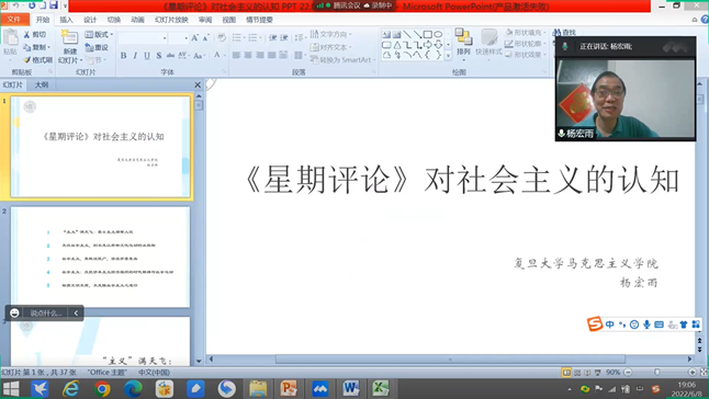 杨宏雨教授围绕《星期评论》对社会主义的认知这一主题,从五个方面展开论述:“‘主义’满天飞”“不谈社会主义,则不足以称新文化运动的出版物”、“社会主义,其概说既广,学派亦甚复杂”“社会主义:反抗资本主义经济组织的时代精神与社会运动”“物质文明不高,不足阻社会主义之进行”。首先,杨教授对中国传统典籍中的“主义”和现代汉语中的“主义”分别做了阐释。接着杨教授梳理了“社会主义”一词的起源和传播——源于古拉丁文,十九世纪二三十年代作为资本主义的对立面和否定物在英国和法国出现,十九世纪八十年代在日本开始传播,在“师日维新”运动中从日本传入中国。随后,杨教授从《星期评论》文章中所提及的各个主义的名称入手,总结了当时国内知识分子对共产主义的六种看法,分析了该刊对各种社会主义思潮的态度。之后讲述了《星期评论》对什么是社会主义的认识,从戴季陶、李大钊关于社会主义一词的理解入手,总结到该刊体现了社会主义的正当性、正义性和时代性。最后,讲到中国传统文化中社会主义的思想为新思想的传播做了铺垫工作,总结了《星期评论》对未来社会的构想,指出中国未来发展的方向应当是反对世界的资本主义,顺应社会主义的世界历史的大趋势。