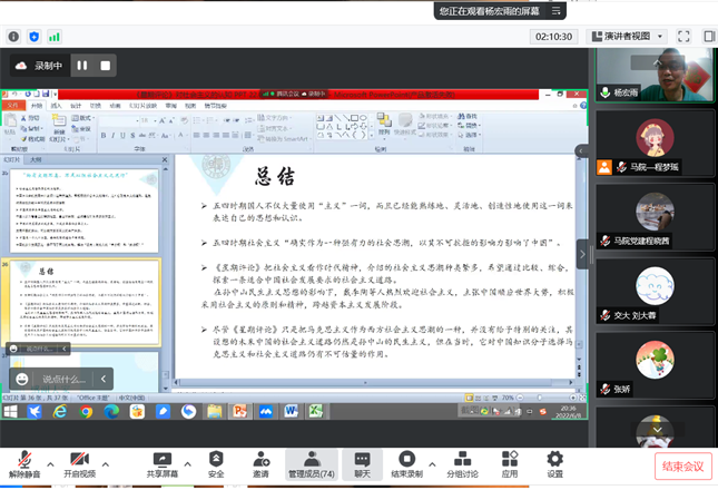 师生开展学术报告表示感谢,并对本次讲座进行了简要的总结概括,认为杨教授做了一场优秀的早期马克思主义传播的学术讲座,一定程度上还原了历史场景,对今天的“四史”研究也有一定的启示意义。汪老师接着希望全体师生向杨教授严谨治学的态度学习,不断提升学术素养。