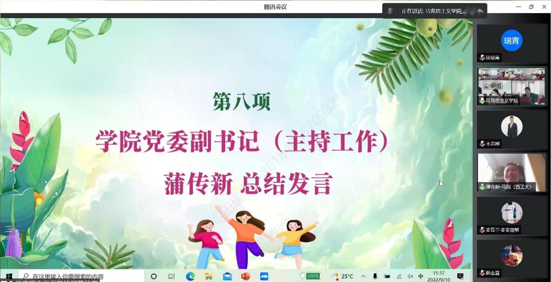 最后,学院党委副书记(主持工作)蒲传新进行发言总结,他指出,面对百年未有之大变局,新时代的青马学子须厚植家国情怀,勇担时代使命,秉承“公诚勇毅”的校训,发扬“三实一新”的校风,不断追求卓越,开创更加美好的未来!