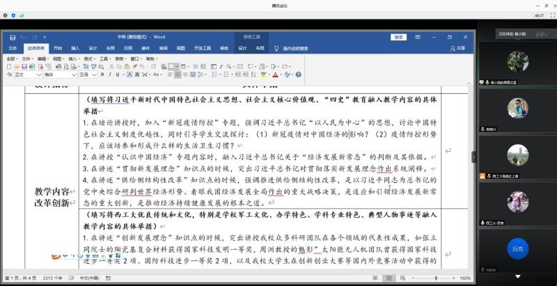 2020-2021秋学期思政课改革创新教学设计规划表》,结合授课专题,从教学内容、教学模式、教学方式、教学资源等方面对课程创新点进行了充分规划设计。将习近平新时代中国特色社会主义思想、社会主义核心价值观、“四史”教育、西工大优良传统和文化、时政热点等有机融入课程,对探究式、体验式、互动式、分众式以及线上线下混合式、现场教学等教学模式以及课堂辩论、演讲、展示、邀请专家同上一堂思政课、远程连线专家、雨课堂信息技术手段运用等教学方法都进行了有效尝试,并充分挖掘慕课、优质教辅材料、视频资料等教学资源。四位点评教授分别对每位教师的说课从内容到形式进行了精彩点评。