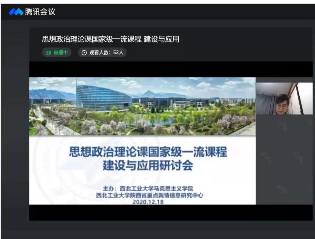 陕西省重点舆情信息研究中心全国范围率先举办的思想政治理论课国家级一流课程建设与应用研讨会于2020年12月18日上午在腾讯会议顺利举办。来自北京大学、复旦大学、武汉大学等多个高校的获批国家一流课程(思政类)的专家学者齐聚一堂,传经送宝,就如何更好地开展思想政治理论课国家一流课程建设的经验和今后举措进行了研讨交流。