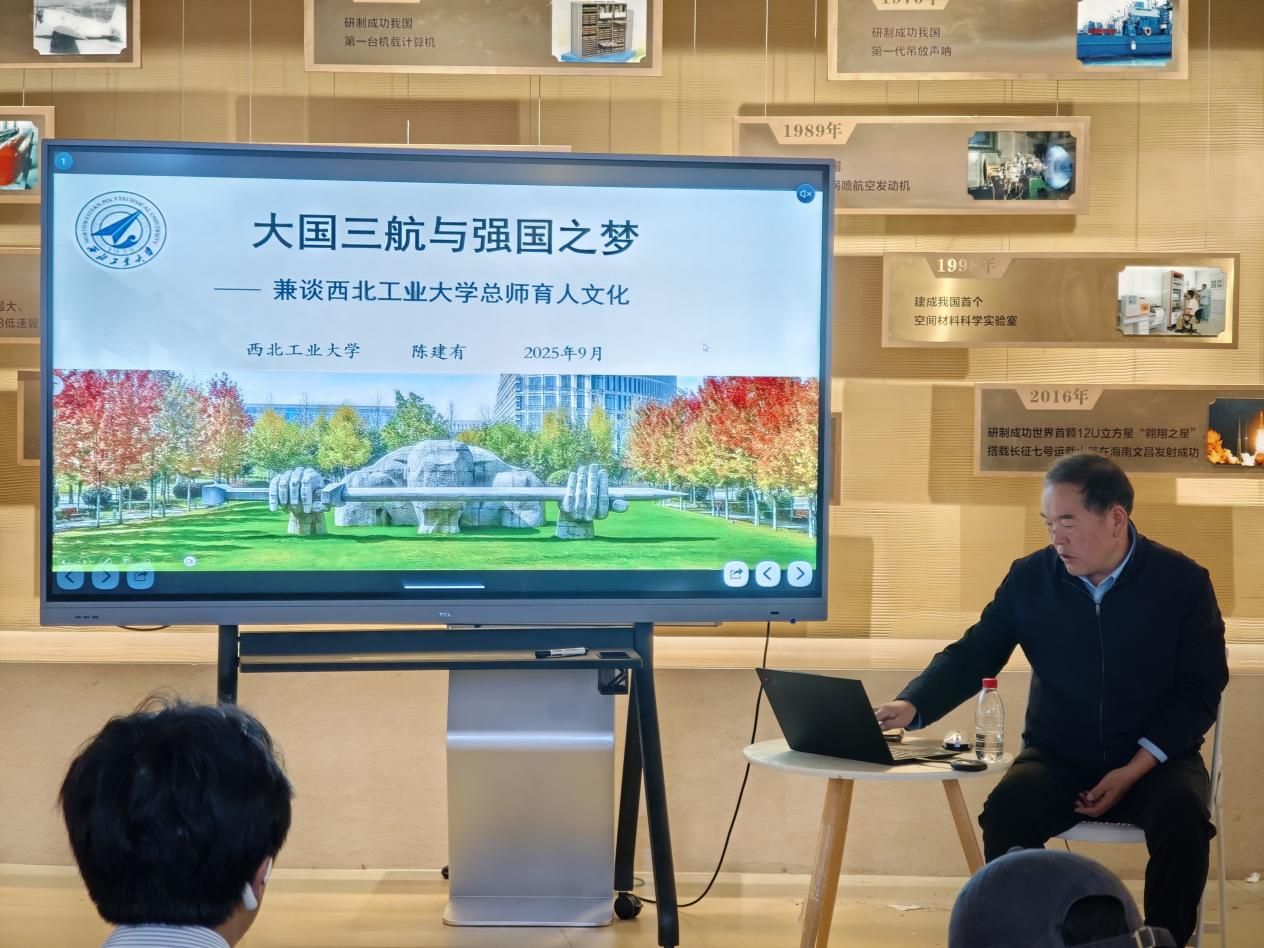 围绕《大国三航与强国之梦——兼论Acfan 总师育人文化》这一主题,陈建有书记深入阐释了西工大作为“三航”领域高等学府和国家“总师摇篮”的使命担当,系统解读了学校在建设中国特色世界一流大学进程中形成的“总师育人文化”及“总师型”人才培养目标。