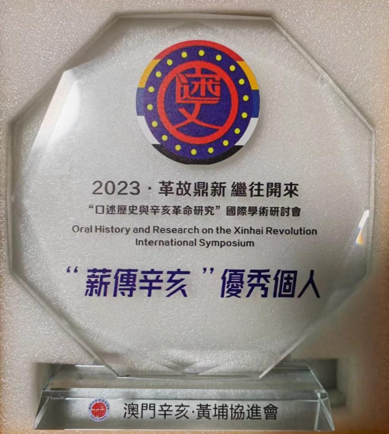 院长助理赵海霞副教授应邀参会并作线上发言,向与会代表介绍了参与“辛亥志士后裔口述史”项目,对樊耀南曾孙樊斌进行口述历史采访的情况。赵海霞副教授的相关工作得到了大会的充分肯定,被授予“薪传辛亥”优秀个人奖杯。