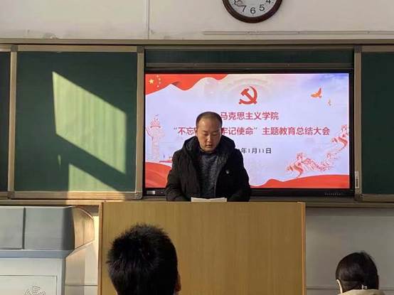 “不忘初心、牢记使命”主题教育总结报告。他从学院基本情况、学院开展主题教育的总体评价和学院主题教育的做法及成效等几个方面详细介绍了学院“不忘初心、牢记使命”主题教育开展情况。报告指出,学院在党委的指导下,高质量抓好学习教育,密切联系实际抓好调查研究、检视问题和整改落实、创新方式方法抓好党支部主题教育,围绕主题教育,密切结合学院实际工作,在工作中取得一定成效,学院今后将坚持常态化开展“不忘初心、牢记使命”主题教育,促进马院各项工作取得新进展,突破制约学院发展的瓶颈。