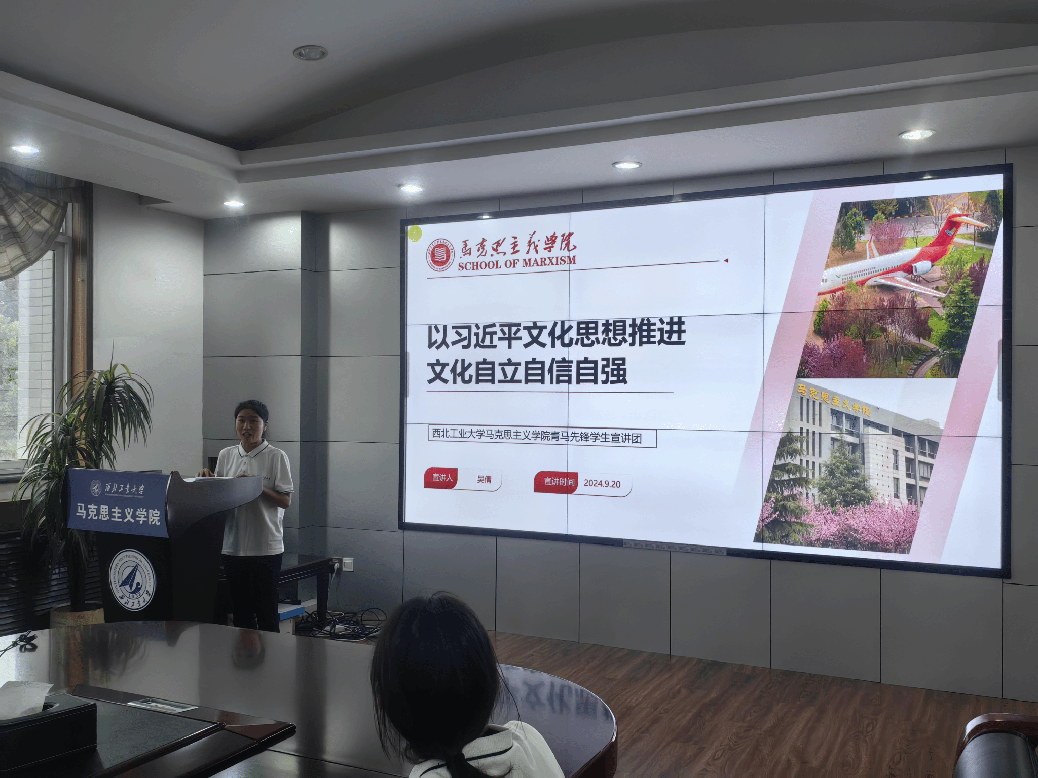 青马先锋学生宣讲团两位成员分别进行主题宣讲。吴倩同学以《以习近平文化思想推进文化自立自信自强》为题,围绕巩固文化主体性、讲好中国故事、推进“两个结合”、高质量推进特色育人文化建设四个方面进行阐述。谢琳同学以《自觉做勇于担当作为的不懈奋斗者》为题,结合何功伟、廖俊波、陈士橹的先进感人事迹,阐释了自己对新时代青年责任担当的思考和理解。