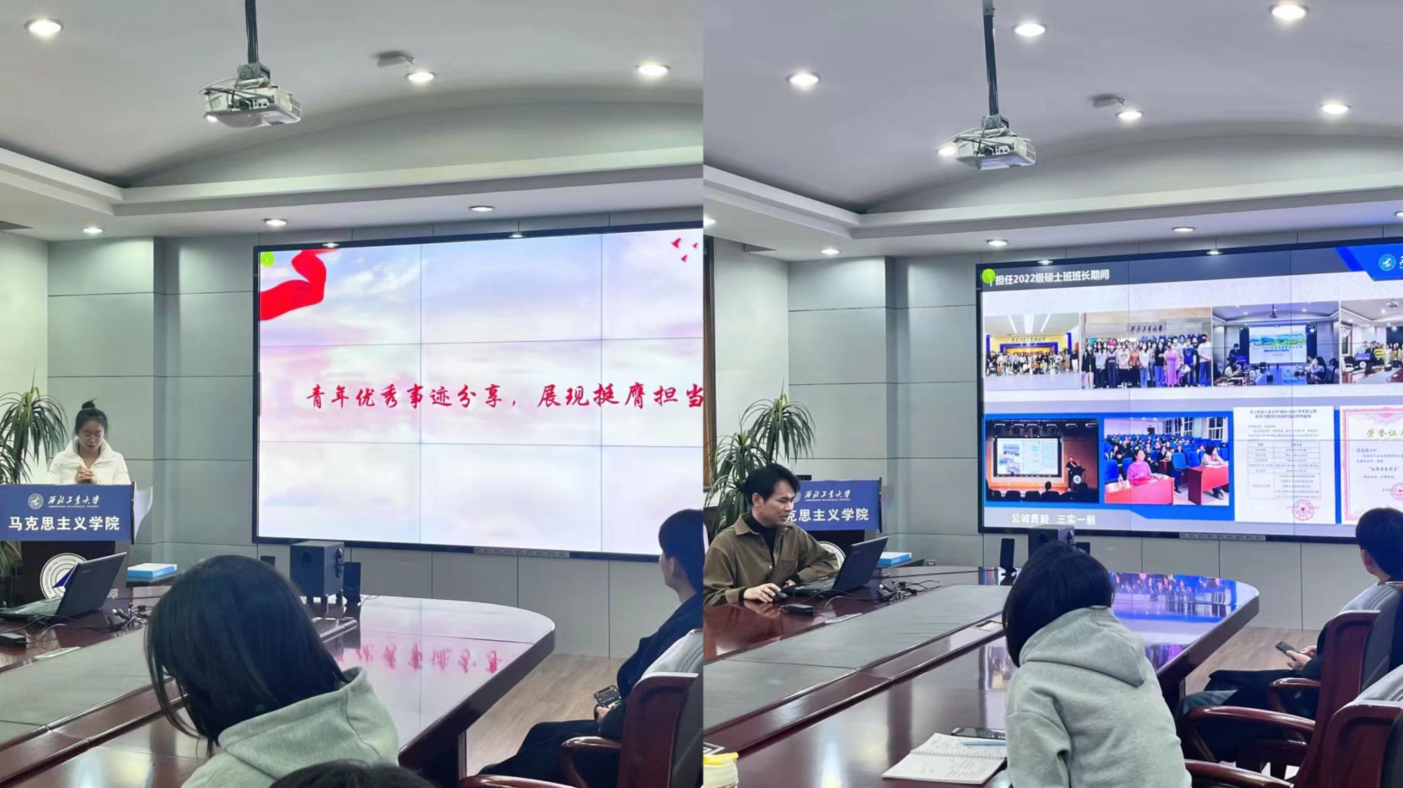挺鹰担当先进学生代表从自身学习、工作、生活出发分享个人事迹。中国近现代史基本问题研究系团支部书记杨京翰讲述了担任学院2022级硕士班班长以来的工作成效和工作感想,2023级硕士生樊小燕分享了在学院担任助管工作中的点点滴滴。在场每位青年团员都认真聆听,在对标支部优秀团员的过程中找寻自身不足,涵养进取品格。