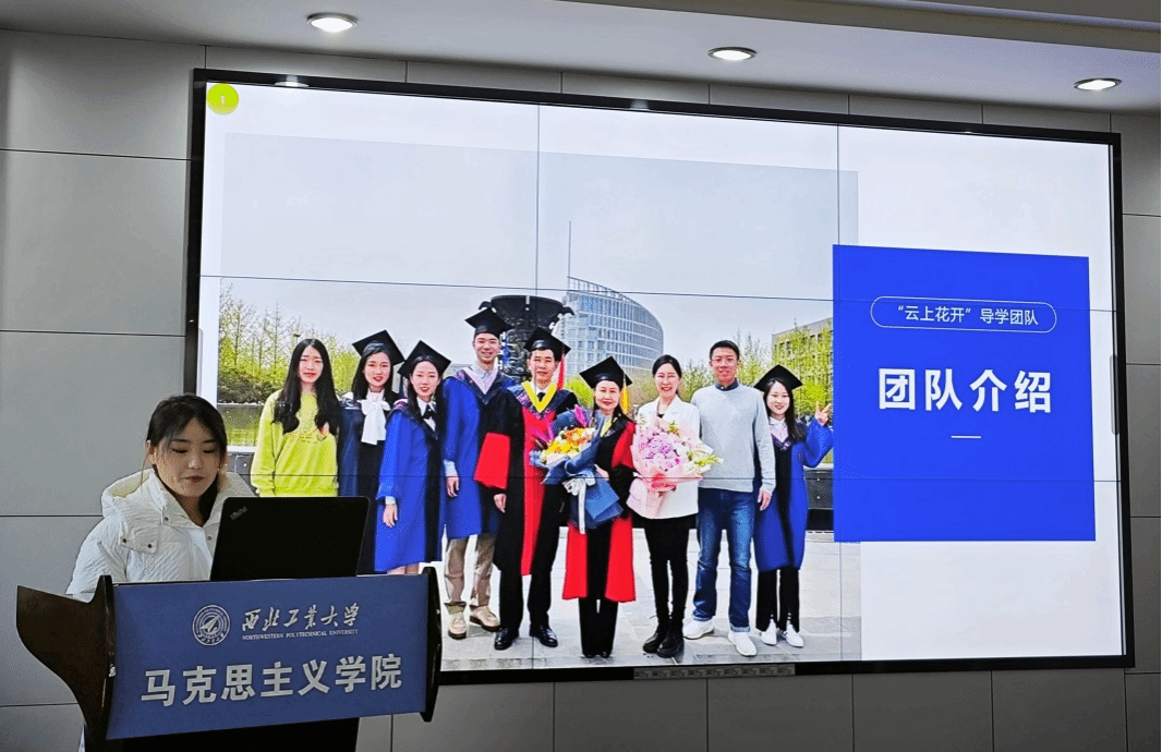 张肖丽首先介绍了团队情况,之后从导师、学生和团队三个层面分别进行了详细地分享,谈到导师尽心尽责、言传身教、立德树人的高尚品德;同学们积极主动、坚持理论联系实际的优良学风、学术品格以及团队有组织有纪律的合作经验。最后表示,在未来,“云上花开”研究生导学团队将放下荣誉,重新出发,始终牢记西工大人“公诚勇毅”校训,不断发扬“三实一新”校风,在学术研究和实践锻炼等各领域努力发挥模范先锋作用,树立西工大人榜样标杆,彰显新时代青年马克思主义者的风采!