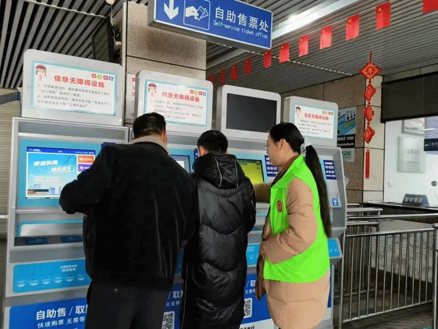 在繁忙的售票处,面对着众多不熟悉网络售票系统的旅客,志愿者们耐心地解答问题,引导旅客顺利完成取票。在老年群体中,志愿者们更是用心去关怀,每当遇到行动不便的老人,他们会主动询问车次信息,并亲自护送老人到候车区域,确保他们能够安全、舒适地等候发车。