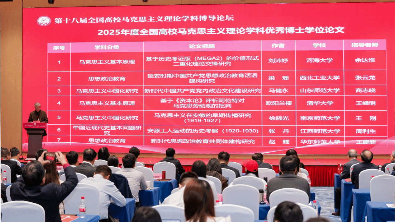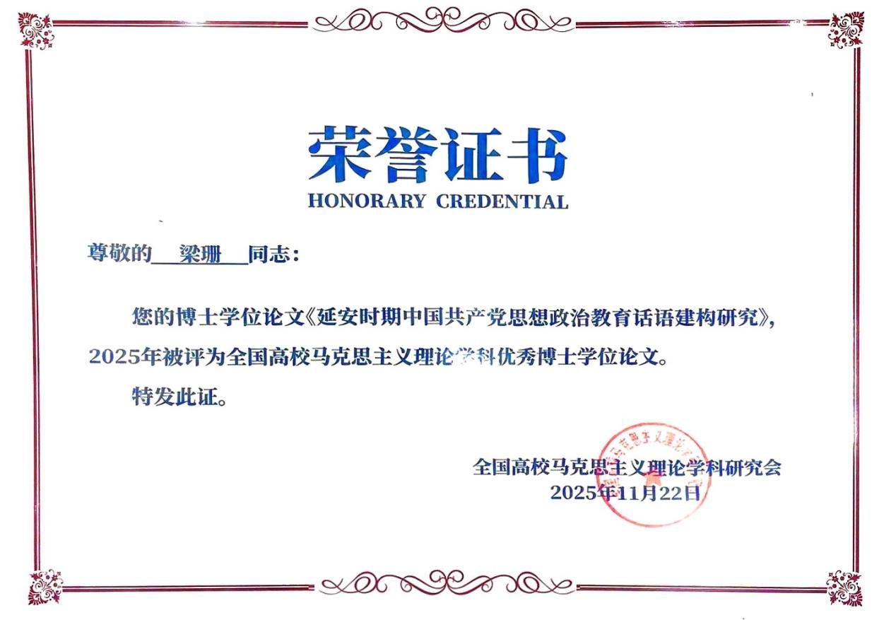 2025年11月22日,第十八届全国高校马克思主义理论学科博导论坛在海口举行,会议期间同步举行了2025年度全国高校马克思主义理论学科优秀博士学位论文颁奖仪式。Acfan Acfan 2022届毕业生梁珊的博士学位论文《延安时期中国共产党思想政治教育话语建构研究》成功荣获该奖项,其指导教师为张云龙教授。