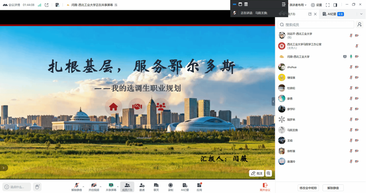 就业赛道的3名选手定位清晰、准备充分,凭借丰富的实践经历与精准的岗位适配规划脱颖而出。廖宇轩以基层治理为职业目标,结合汶川地震重建见闻、精准扶贫实践、社会调查经历阐明职业初心,充分展现西工大青年“专业精、系统强、重实践、能担当”的综合素养;闫薇规划务实,岗位适配性强;廖勇提出“马理论+物流”跨领域路径,立足区位优势展现多元思维。