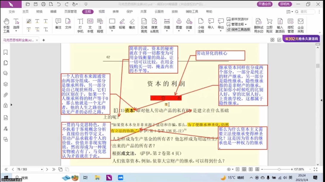 第一小组由马妍同学进行汇报,她就《手稿》的序言和工资部分进行了总结汇报,同时小组同学也提出了自己的问题:是否存在一种既保障工人利益又不影响企业经营的工资制度?张云龙老师认为首先要注意到,对于雇佣制度的批判是在近代平等观念深入人心之后才出现的,比如萨伊的“三位一体”公式,但是马克思则注意到了观念上的平等不能掩盖事实上的不平等,因此提出了剩余价值理论,揭示了资本主义社会的内在矛盾。聂阳老师同样认为在工资上做文章来改善工人的待遇是蒲鲁东的做法,马克思则与其相反,他认为工资制度是私有财产制度的具体体现,因此从本质论的角度来分析,这个问题的答案不存在的。山磊老师也认为这一调和不可能实现,因为他和蒲鲁东以及拉萨尔的论战中都是批判工资的,但是值得注意的是恩格斯晚年已经看到了工人资产阶级的出现,这一阶级在目前的资本主义国家已经发展壮大。而杨荣老师补充到,马克思认为不公平的地方在于工人和生产资料分离了,如果要在工资制度下解决这个问题的话,第一就是要工人占有相应的生产资料,那就是入股分红的形式;第二就是保护工人的利益,比如工人的专利会享有一定的收益,我们现在要想在工资前提下实现平等就要实现生产资料平等、要素平等以及分配平等,社会问题远比理论问题要难很多。