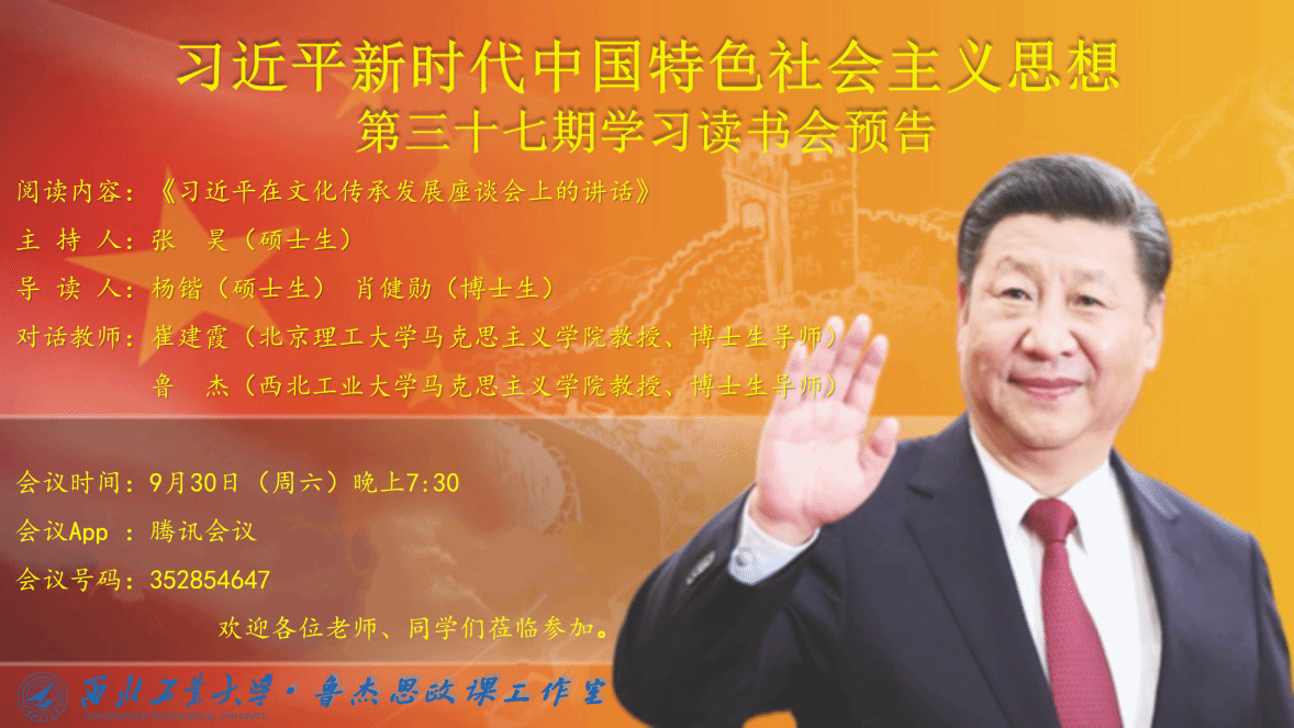 习近平新时代中国特色社会主义思想学习读书会第三十七期活动主题围绕《习近平在文化传承发展座谈会上的讲话》进行学习研讨。本次读书会由学院思想政治教育系主任、博士生导师鲁杰教授发起,学院硕士生张昊主持,北京理工大学Acfan
