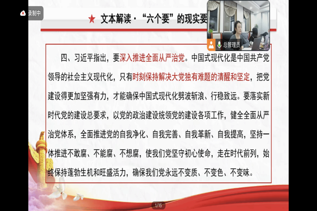 随后,博士生李旭同学从毛泽东同志的伟大实践、历史贡献、历史地位的角度进行了精彩的导读。她强调了开辟马克思主义中国化时代化新境界、进一步深化改革开放、深入推进全面从严治党等“六个要”的现实要求,特别强调了“只有时刻保持解决大党独有难题的清醒和坚定,把党建设得更加坚强有力,才能确保中国式现代化劈波斩浪、行稳致远。”同时,她还聚焦毛泽东思想活的灵魂以及当前的研究现状,为师生们提供了宝贵的学术视角。最后她用充沛的情感,引用毛泽东同志的一段话作为结尾:“东方欲晓,莫道君行早。踏遍青山人未老,风景这边独好。”