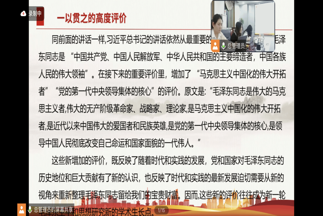 在导读环节中,最先进行导读的同学是硕士生伍雪同学。她从一以贯之的高度评价开始,深入探讨了毛泽东同志作为伟大国际主义者和历史贡献者的地位,并从新加入的评价的视角,提出了自己独到的见解。另外,她详细阐述了毛泽东思想的三个活的灵魂。最后,她还结合各位专家研究成果,提出了以中国式现代化贯通历史、现实与未来的新思考。
