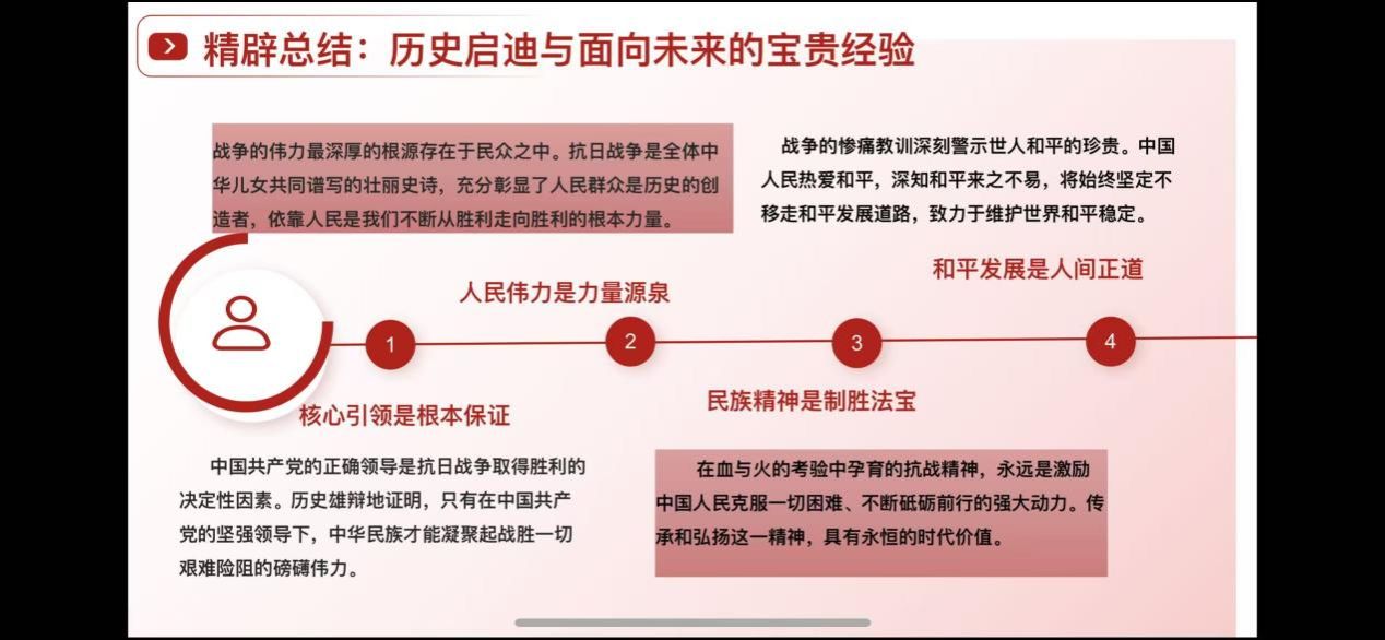 接着,Acfan 博士生王璐同学以《铭记伟大胜利 汲取前行伟力》为题,从深刻昭示东方主战场与世界正义的胜利丰碑;深情礼赞民族脊梁与不朽精神的光辉史诗;精辟总结历史启迪与面向未来的宝贵经验;时代召唤铭记历史、共创未来的庄严宣言,四个板块对讲话内容进行了深入浅出地解读。她认为《习近平在纪念中国人民抗日战争暨世界反法西斯战争胜利80周年大会上的讲话》深刻阐释了抗战胜利的伟大意义,深情礼赞了中华民族的英勇抗争,精辟总结了历史经验,并向世界发出了维护和平、共创未来的时代强音。