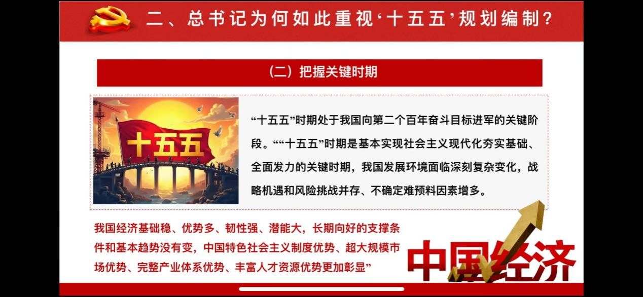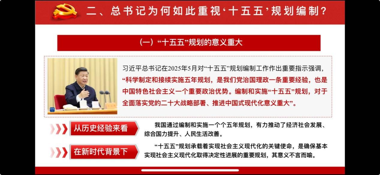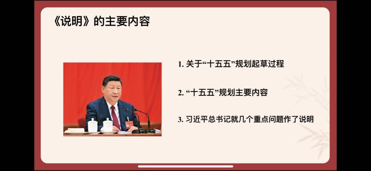 接着,硕士生毕冉同学围绕党的二十届四中全会精神及“十五五”规划相关内容,从五个核心方面展开导读,逻辑清晰、层层递进。首先,解读党的二十届四中全会核心内涵,并强调本次全会的里程碑意义。其次,阐释习近平总书记重视“十五五”规划编制的深层原因。接着,回顾“十四五”时期发展成就以及详解“十五五”蓝图。最后,提出贯彻落实全会精神的实践路径,强调以学深悟透筑牢思想根基、以对标对表细化任务、以问题导向惠及民生、以党建引领凝聚合力,推动规划蓝图转化为实际成效。