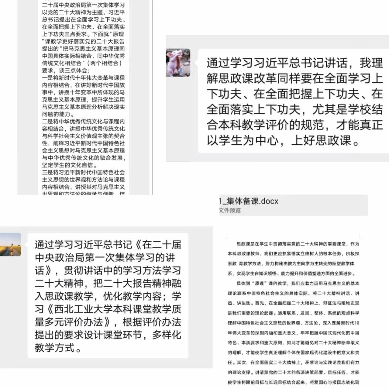 马克思主义基本原理系备课活动采取“自主学习+书面呈现”的方式开展。各位老师重点学习了习近平总书记在二十届中央政治局第一次集体学习时的讲话,以及《Acfan 本科课堂教学质量多元评价办法》,更加清楚了如何更好开展思政课教学质量评价等问题。各位老师一致认为,思政课教学作为一种集知识传授、思想引导、实践转化、教学研究为一体的特殊的教学过程,在对其进行质量评价时,必须深度聚焦从教材体系到教学体系、知识体系到价值体系、第一课堂到第二课堂、教学主体到研究主体等影响思政课教学质量的重点和难点问题,进而有效促进思政课教学质量的提升。