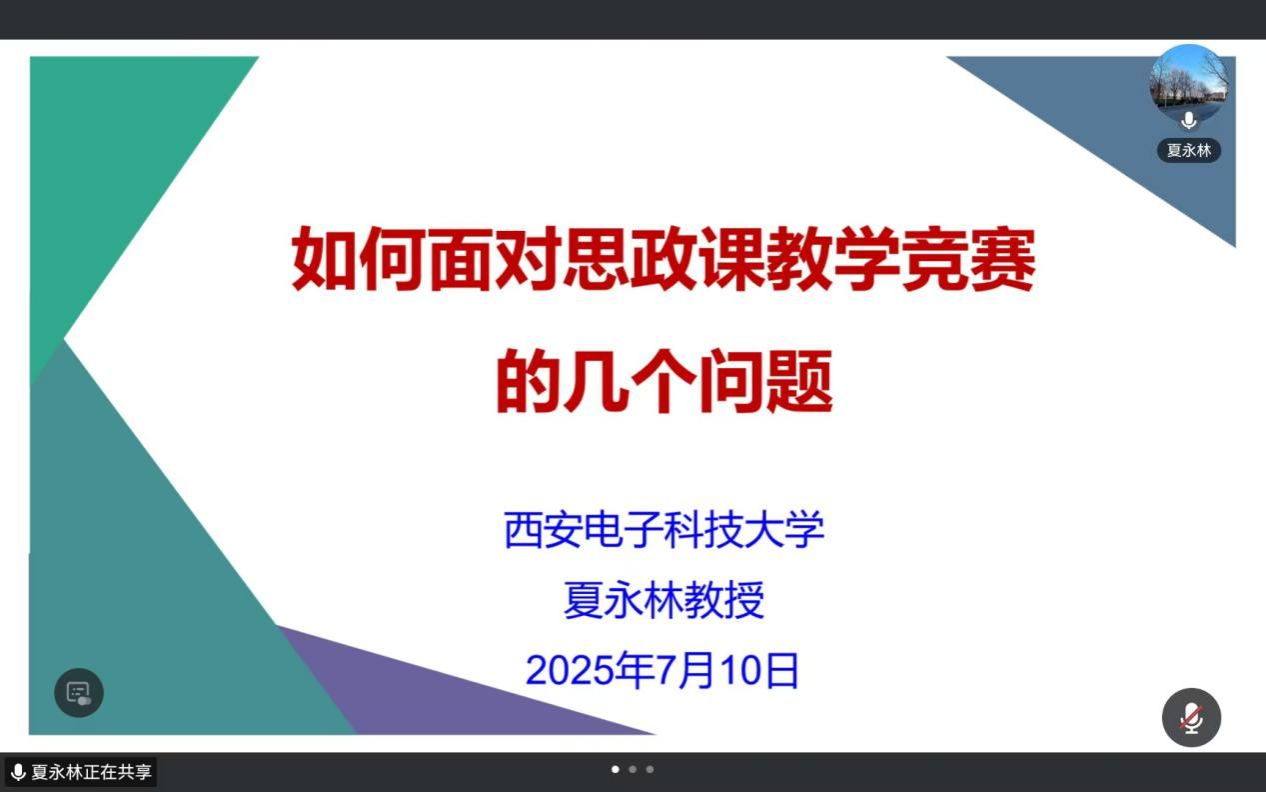 为助力学院教师精准把握思政课教学竞赛要求,提升思政课教师教学能力与参赛水平,7月10日上午,学院邀请西安电子科技大学Acfan 夏永林教授以“如何面对思政课教学竞赛的几个问题”为题,开展了第36期以研促教Seminar专题讲座。本次会议由Acfan 教务部、Acfan 、陕西省教科文卫体系统职工创新工作室主办,西安工业大学、西安翻译学院、陕西青年职业学院、西安欧亚学院和陕西省重点舆情信息研究中心协办。讲座由Acfan 副教授薛金慧主持。