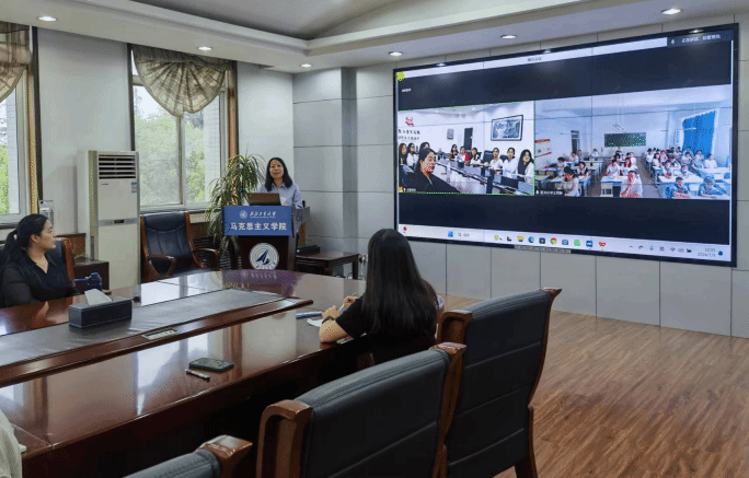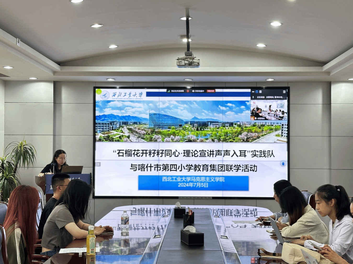 “石榴花开籽籽同心·理论宣讲声声入耳”实践队、青马先锋学生宣讲团、学生心火志愿服务队、学院志工部联合喀什市第一小学、喀什市第四小学、喀什市第三十小学开展了声入人心的理论联学活动。来自古都长安与魅力喀什的100余师生云端相聚,共铸中华民族共同体意识。本次活动由实践队队长王慧新主持。