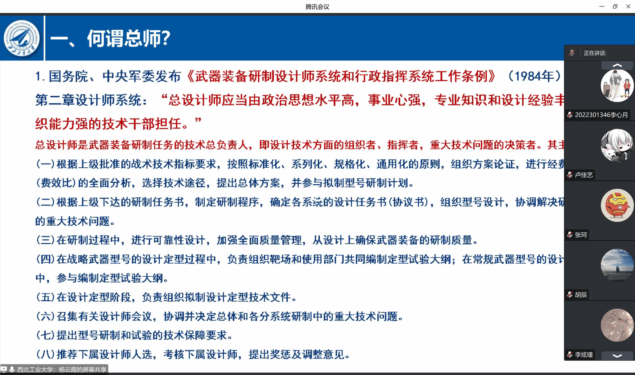 院长杨云霞为其联系的DL032207班在线讲授了主题为“对总师文化及‘总师型’人才培养的一点思考”的思政课,班级25名同学全体参与并展开了研讨。