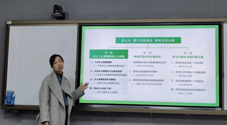 本次示范课,李婷展示的主题源于课程第五章“遵守道德规范 锤炼道德品格”,主要围绕“道德的起源”“道德的本质”“道德的发展”等方面进行充分地理论阐释,为帮助学生更好理解道德的变化与发展,示范课巧妙对比了人类社会法律的发展与演化进程。