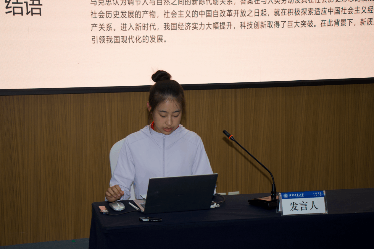 硕士研究生韩瑞欣从新质生产力破解西方现代性文明危机、创造人类文明新形态、开辟生产力跃迁新境界为出发点,分享了新形势下加快发展新质生产力的几点思考;陕西理工大学Acfan