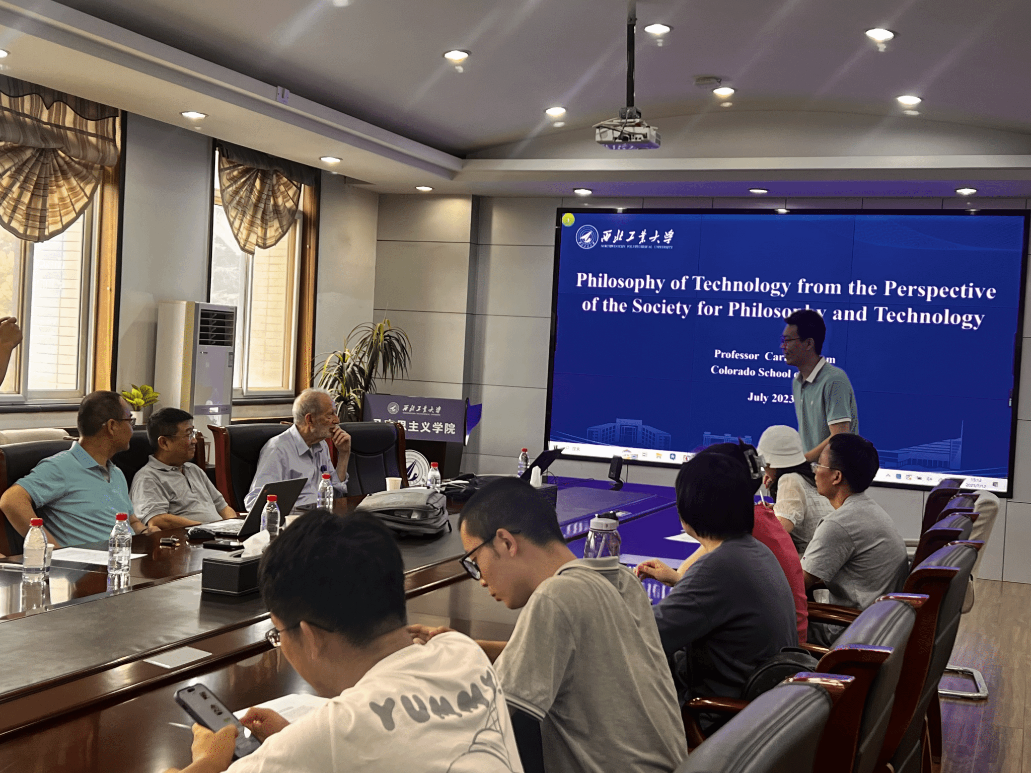 on 12 July 2023 at 3 p.m., Carl Mitcham, a famous contemporary philosopher of technology and engineering ethicist, the first president of the Society for Philosophy and Technology (SPT), and a professor of the College of Humanities, Arts and Social Sciences of Colorado School of Mines, was invited to the School of Marxism of Northwestern Polytechnical University for academic exchanges. Professor Deng Bo of Xi'an University of Architecture and Technology, Professor Ma Delin of Xi'an University of Electronic Science and Technology, Professor Zhang Yunlong, Assistant Professor Chen Qianqian and current graduate students of the School attended the seminar. Associate Professor Lv Tianze of the School of Marxism hosted the meeting.