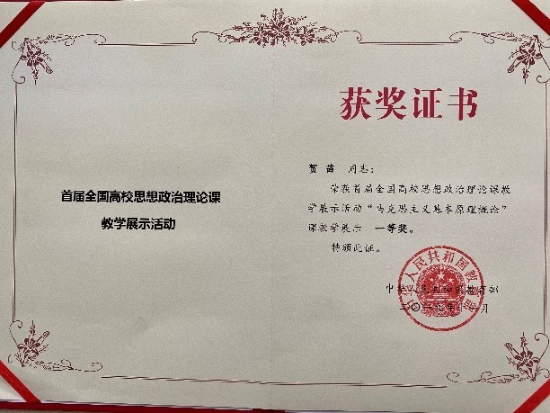 A few days ago, the certificate of “the first teaching exhibition activity for ideological and political theory course in national colleges and universities” was issued by the Ministry of Education. The good news was that two teachers of School of Marxism got this honor, with He Miao and Pu Yao winning the first prize and the second prize respectively. This is another great achievement that School of Marxism has made in the national teaching activities for ideological and political theory courses.