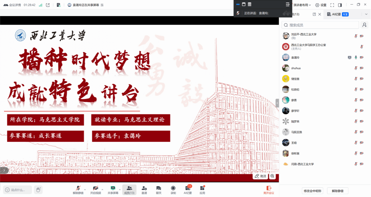 就业赛道的3名选手定位清晰、准备充分,凭借丰富的实践经历与精准的岗位适配规划脱颖而出。廖宇轩以基层治理为职业目标,结合汶川地震重建见闻、精准扶贫实践、社会调查经历阐明职业初心,充分展现西工大青年“专业精、系统强、重实践、能担当”的综合素养;闫薇规划务实,岗位适配性强;廖勇提出“马理论+物流”跨领域路径,立足区位优势展现多元思维。