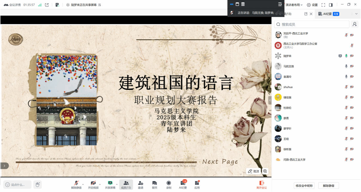 本次选拔赛设置成长赛道与就业赛道,7名马克思主义理论专业学子分赛道同台竞技。选手们的职业规划方案兼具思想深度和实践价值,充分展现了青马学子的理想追求与综合素养。成长赛道4名学子职业规划兼具理想与务实。桂志森聚焦马理论研究与教学,拟深耕社科学术厚土并打造工科特色思政课堂;袁蔼玲以高校思政课教师为目标,展现扎实功底与教学反思;徐彬慧创新“快板+中华优秀传统文化+实践传播”模式,规划职业发展路径;陆梦来结合自身特质,聚焦马克思主义中国化时代化等领域研究。
