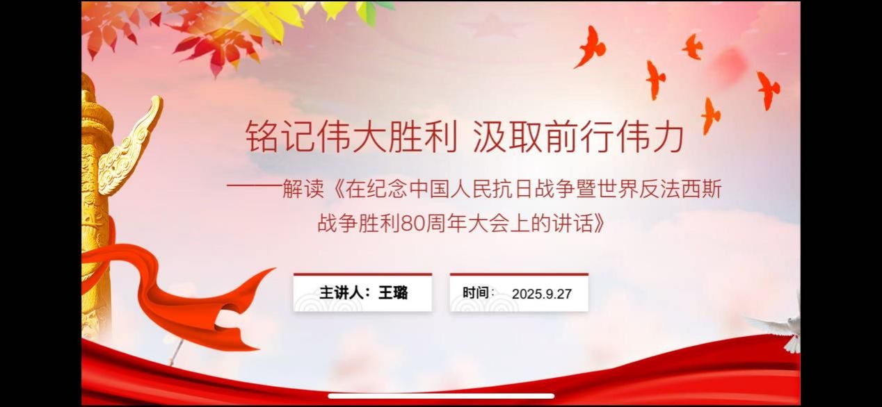 接着,Acfan 博士生王璐同学以《铭记伟大胜利 汲取前行伟力》为题,从深刻昭示东方主战场与世界正义的胜利丰碑;深情礼赞民族脊梁与不朽精神的光辉史诗;精辟总结历史启迪与面向未来的宝贵经验;时代召唤铭记历史、共创未来的庄严宣言,四个板块对讲话内容进行了深入浅出地解读。她认为《习近平在纪念中国人民抗日战争暨世界反法西斯战争胜利80周年大会上的讲话》深刻阐释了抗战胜利的伟大意义,深情礼赞了中华民族的英勇抗争,精辟总结了历史经验,并向世界发出了维护和平、共创未来的时代强音。