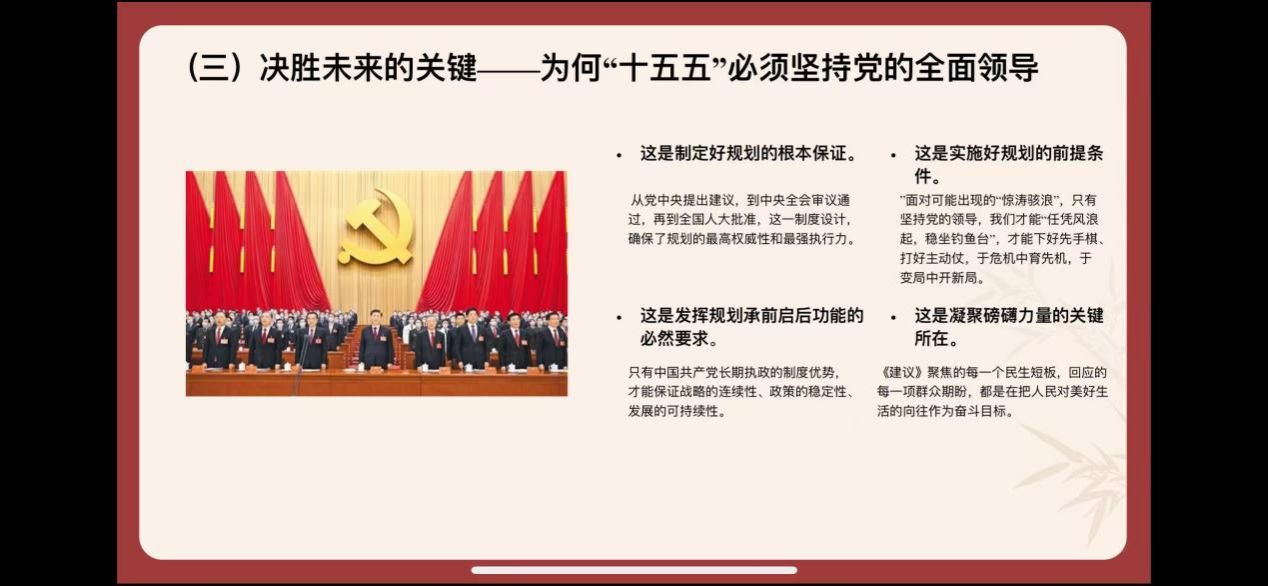 接着,硕士生毕冉同学围绕党的二十届四中全会精神及“十五五”规划相关内容,从五个核心方面展开导读,逻辑清晰、层层递进。首先,解读党的二十届四中全会核心内涵,并强调本次全会的里程碑意义。其次,阐释习近平总书记重视“十五五”规划编制的深层原因。接着,回顾“十四五”时期发展成就以及详解“十五五”蓝图。最后,提出贯彻落实全会精神的实践路径,强调以学深悟透筑牢思想根基、以对标对表细化任务、以问题导向惠及民生、以党建引领凝聚合力,推动规划蓝图转化为实际成效。