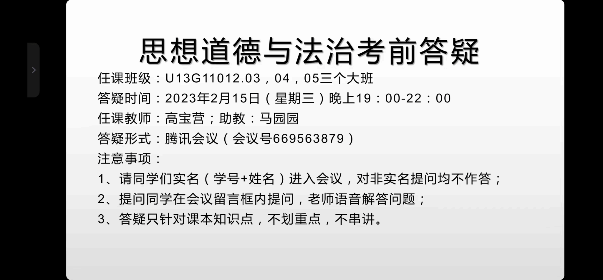 德法与形势政策系于2023年2月15日下午组织12位专兼职教师分别以在线会议的形式就《思想道德与法治》课程进行了考前集体答疑。答疑覆盖本学期全校《思想道德与法治》课程23个大班,共计大一本科生2300余人。本次集体答疑,一是加深了同学们对知识的理解和掌握,学习中及时获得了释疑解惑,对复习增强了兴趣和信心;二是时长三小时的答疑辅导,既是各任课老师对学生学习的辅导过程,又是对学生此次集体复习的精神陪伴。三是作为精准、高效的点对点答疑解惑,加深了师生间的情感联系。